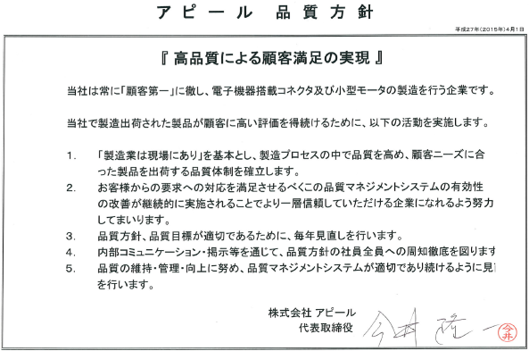 - お客様からの要求への対応を満足させるべくこの品質マネジメントシステムの有効性の改善が継続的に実施されることでより一層信頼していただける企業になれるよう努力してまいります。